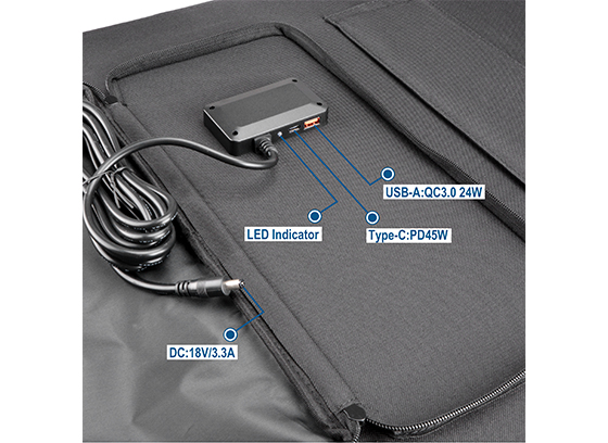 在太阳下给12V~18V电池相关产品及储能设备和给手机/平板电脑/移动电源/PSP/MP4/GPS/蓝牙耳机等5V及QC3.0和PD协议的相关电子设备充电。