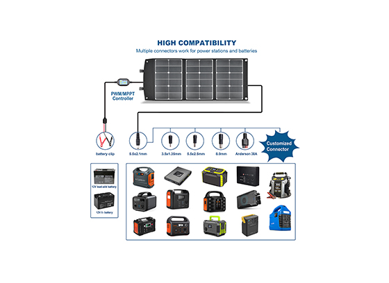 在太阳下给12V~18V电池相关产品及储能设备和给手机/平板电脑/移动电源/PSP/MP4/GPS/蓝牙耳机等5V及QC3.0和PD协议的相关电子设备充电。