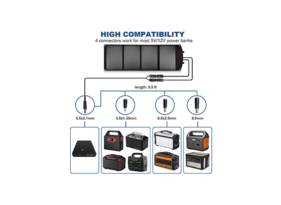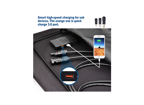 在太阳下给12V~18V电池相关产品及储能设备和给手机/平板电脑/移动电源/PSP/MP4/GPS/蓝牙耳机等5V及QC3.0和PD协议的相关电子设备充电。